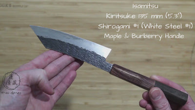 Isamitsu Shirogami #1 / White Steel #1 Kiritsuke 135 mm / 5.3" Brown Two Tone Maple and Burberry Handle