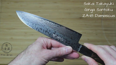 The Ginga 69 layer Damascus steel Santoku knife by Sakai Takayuki is a great length for those looking for a multipurpose kitchen knife that can handle just about anything. That coupled with the ZA-18 stainless steel will make this one of your favorite knives!