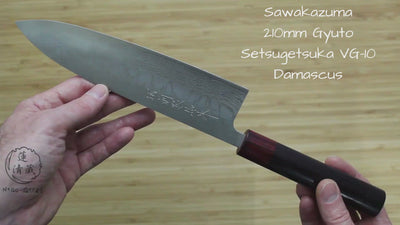 If you are looking to move up to a highly crafted Japanese Gyuto chef's knife, this Sawakazuma Damascus Gyuto is a great place to start. Made out of VG-10 stainless steel it will maintain a great edge while requiring minimal care on a daily basis.